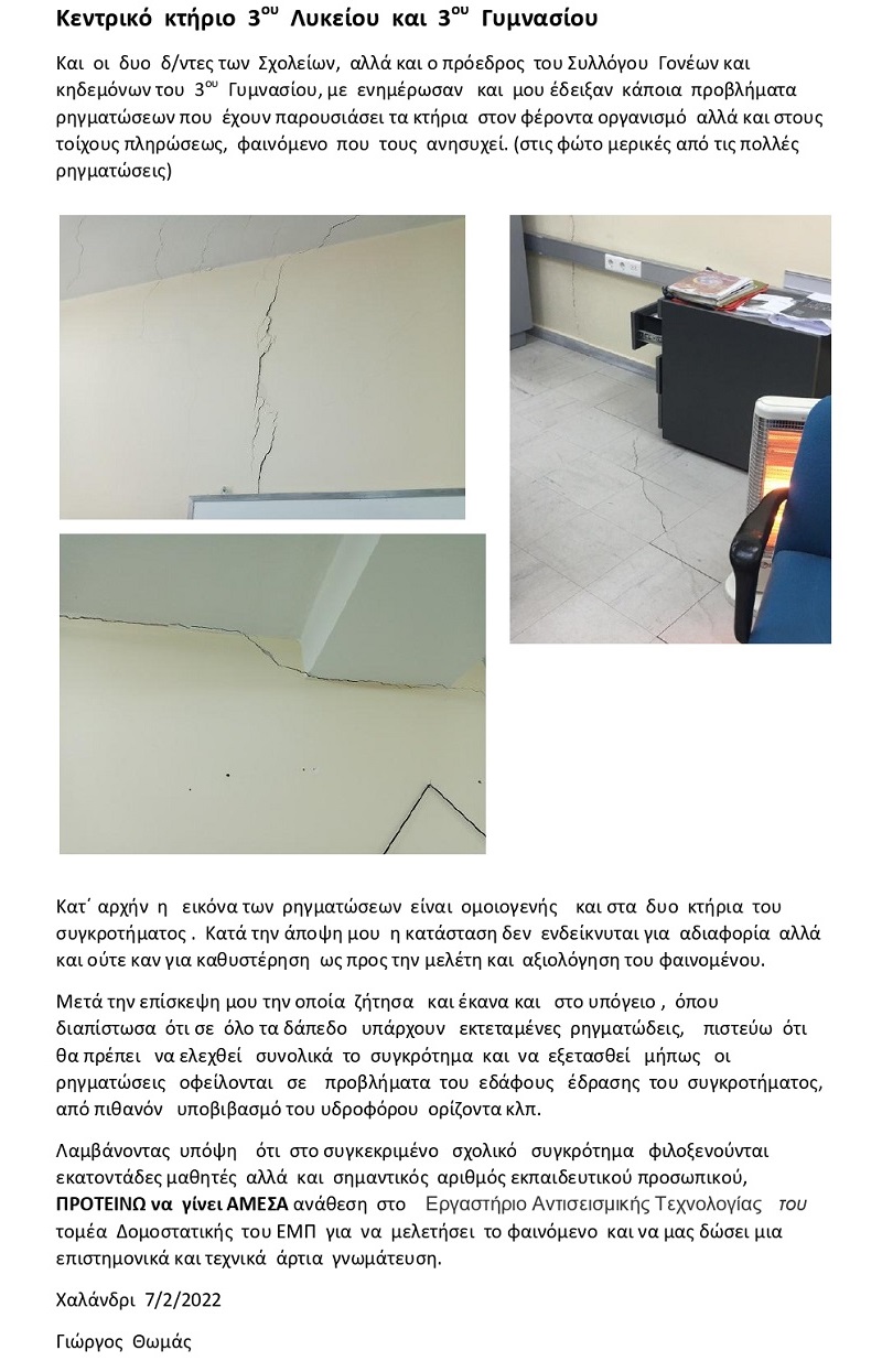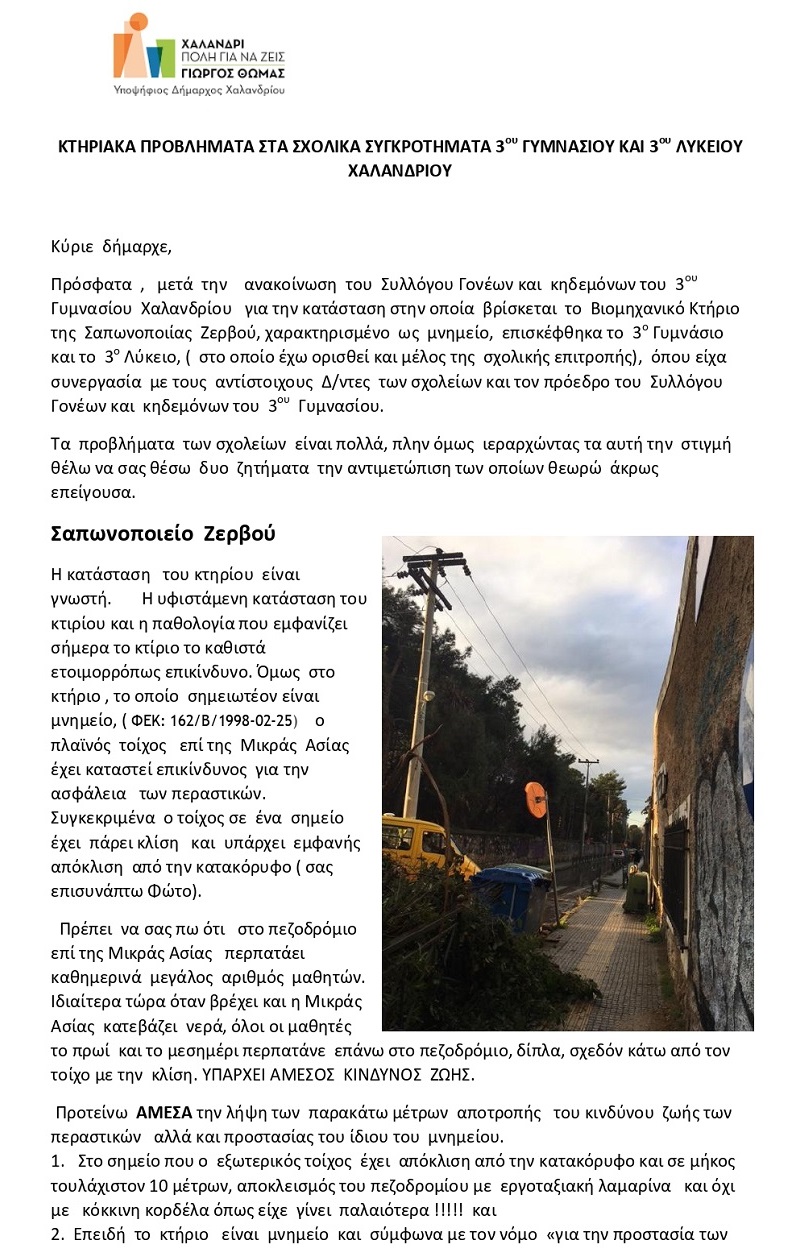Επιστολή προς τον δήμαρχο Χαλανδρίου κ. Σίμο Ρούσσο απευθύνει ο επικεφαλής της δημοτικής παράταξης «Χαλάνδρι, πόλη για να ζεις» κ. Γιώργος Θωμάς, αναφορικά με τα κτηριακά προβλήματα στα σχολικά συγκροτήματα του 3ου Γυμνασίου και του 3ου Λυκείου Χαλανδρίου.