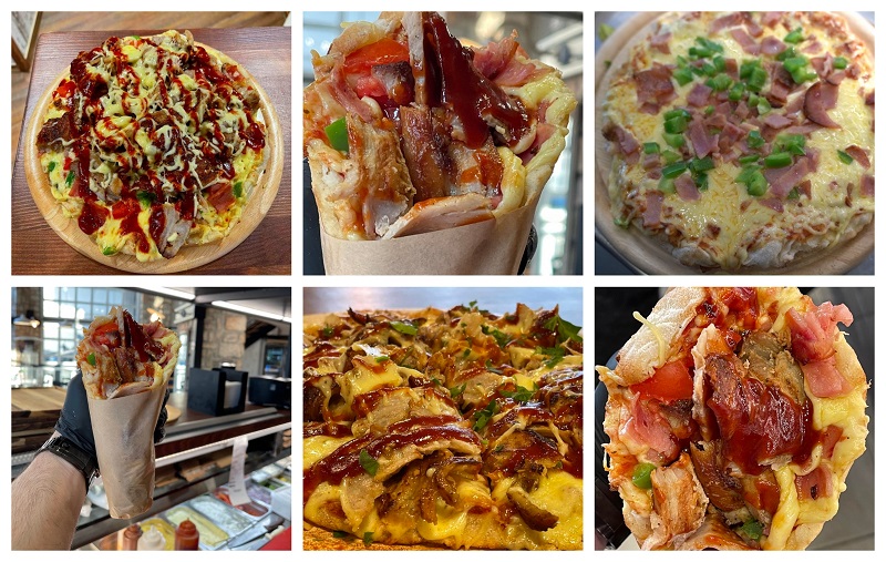 Φαντάσου λοιπόν μια φρεσκοψημένη ζύμη pinsa romana (ανώτερη από τη συνηθισμένη πίτσα) 25 εκατοστών, γεμισμένη ασφυκτικά με gouda, bacon, σάλτσα πίτσας, ντομάτα, πιπεριά, γύρο χοιρινό ή κοτόπουλο και σως bbq ή Caesar!