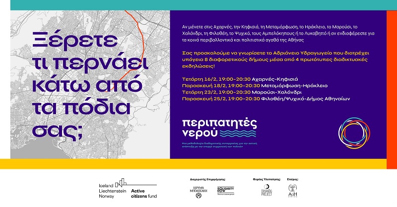 Οι Περιπατητές Νερού σας προσκαλούν σε μια σειρά διαδικτυακών, δραματοποιημένων, διαδραστικών συναντήσεων γνωριμίας με το Αδριάνειο Υδραγωγείο, ένα μοναδικό πολιτιστικό και υδάτινο αγαθό που... διέρχεται κάτω από τα πόδια μας!