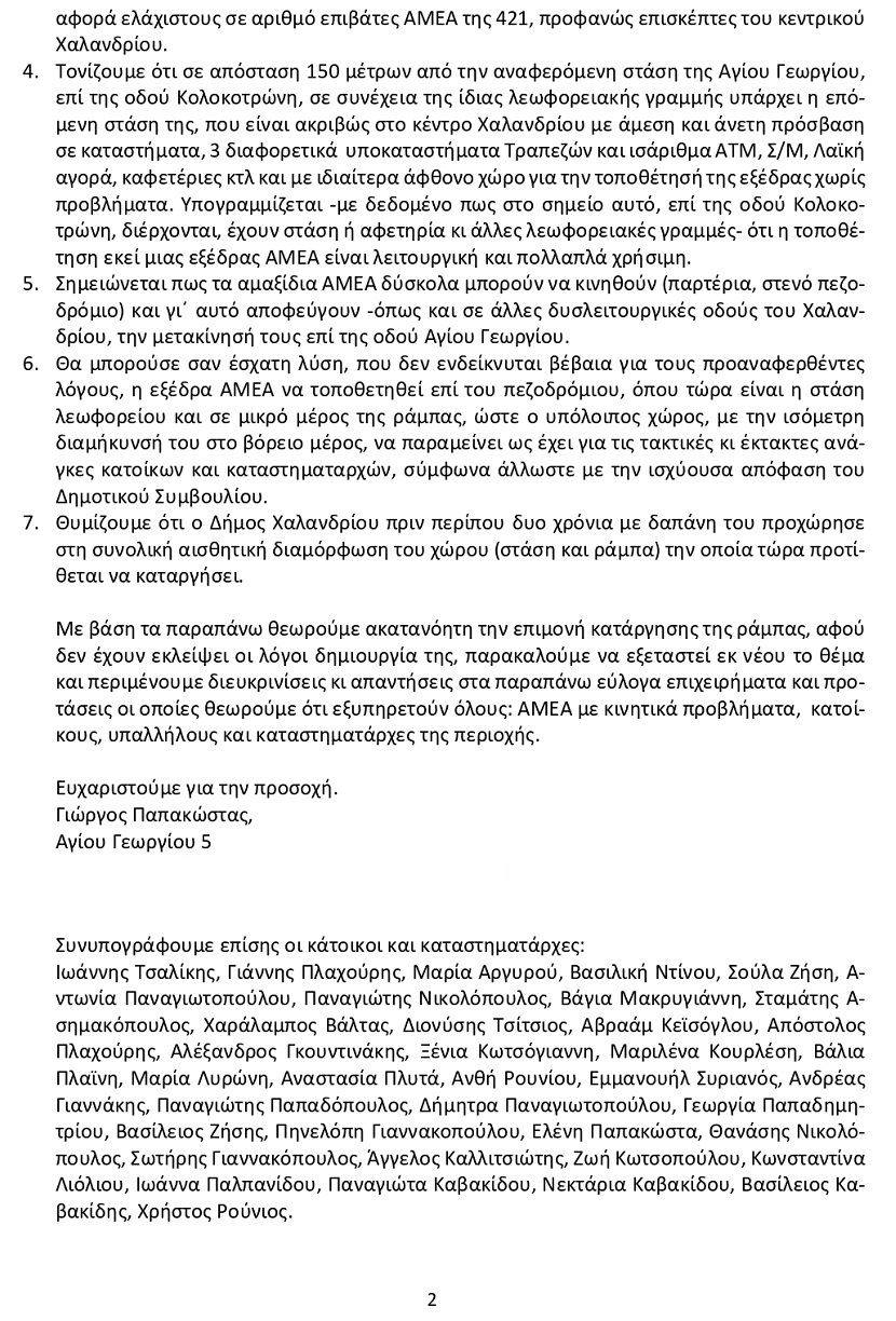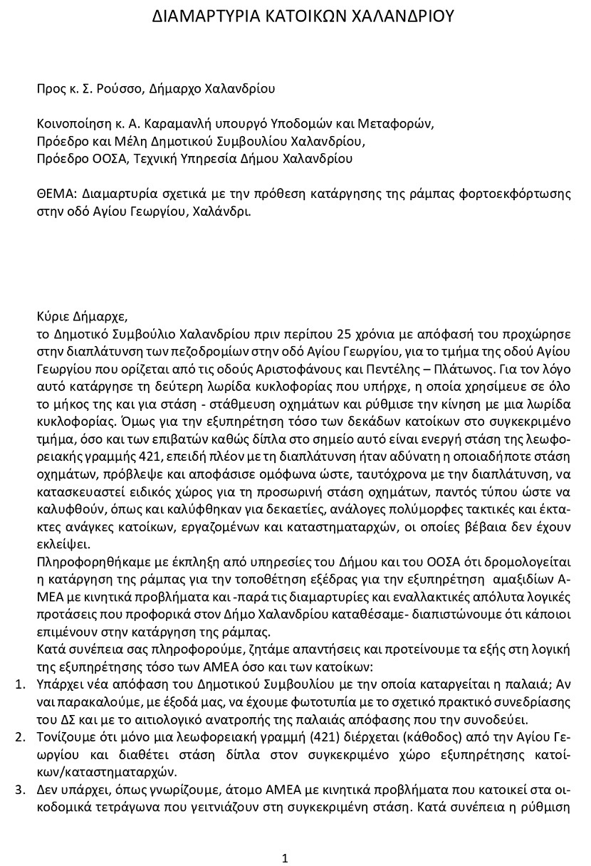 Κάτοικοι και καταστηματάρχες του Χαλανδρίου απευθύνουν επιστολή προς τον δήμαρχο κ. Σ. Ρούσσο, με την οποία διαμαρτύρονται για την πρόθεση κατάργησης της ράμπας φορτοεκφόρτωσης στην οδό Αγίου Γεωργίου.