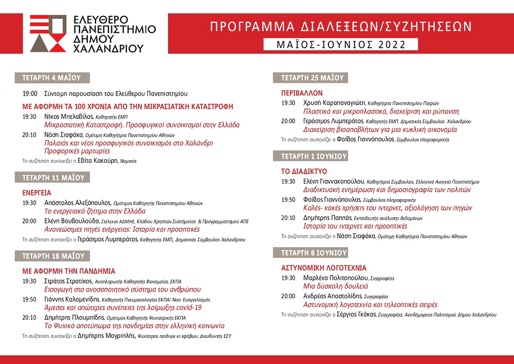 Το Ελεύθερο Πανεπιστήμιο του Δήμου Χαλανδρίου ...ανοίγει τις πύλες του, εν όψει της πλήρους λειτουργίας του από το φθινόπωρο του 2022, με ένα πολύ ενδιαφέρον πρόγραμμα παρουσιάσεων-συζητήσεων ενδεικτικών θεματικών ενοτήτων, από 4 Μαΐου έως 8 Ιουνίου 2022.