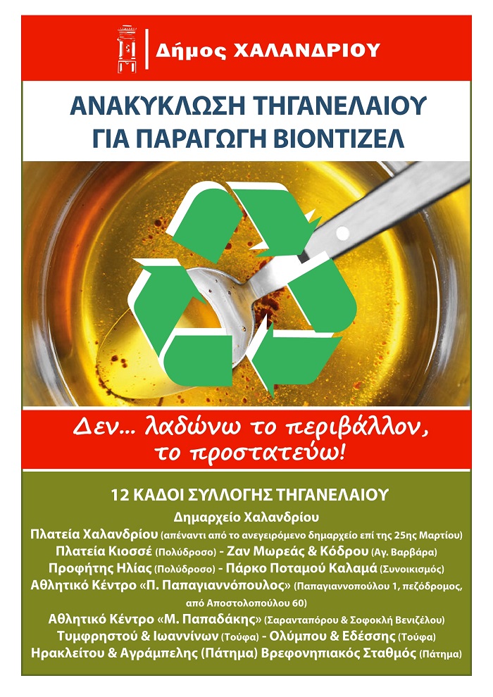 Στο πλαίσιο της εκδήλωσης, που πραγματοποιείται σε συνεργασία με τη Fargeco Hellas, μικροί και μεγάλοι θα ενημερωθούν προφορικά αλλά και με έντυπο υλικό για τα οφέλη της ανακύκλωσης τηγανέλαιων αλλά και τον σωστό τρόπο ανακύκλωσής τους στους ειδικούς κάδους που έχουν εγκατασταθεί στο Χαλάνδρι.