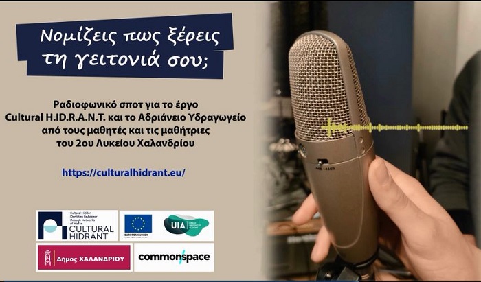 «Νομίζεις ότι ξέρεις καλά τη γειτονιά σου»; Αυτό είναι το κεντρικό μήνυμα του ραδιοφωνικού σποτ* που σχεδίασαν, μελοποίησαν και ηχογράφησαν οι μαθητές και οι μαθήτριες του 2ου Λυκείου Χαλανδρίου για το Αδριάνειο Υδραγωγείο, στο πλαίσιο των Εργαστηρίων Συμμετοχικού Σχεδιασμού, που διοργανώνει η commonspace ως εταίρος του έργου Cultural H.ID.R.A.N.T., που υλοποιείται στον Δήμο Χαλανδρίου στο πλαίσιο του Ευρωπαϊκού Χρηματοδοτικού Προγράμματος UIA.