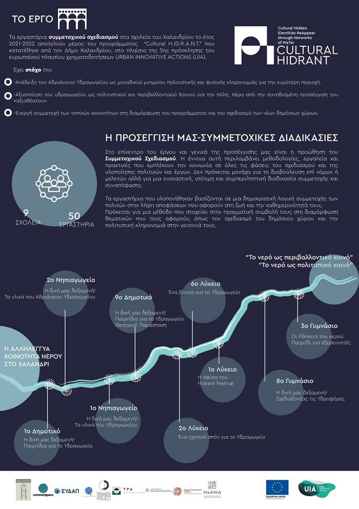 9 σχολεία όλων των βαθμίδων, 600 μαθητές και μαθήτριες από 4 έως 17 χρονών, 50 εκπαιδευτικοί και πλήθος γονέων και κηδεμόνων πήραν μέρος στα συμμετοχικά εργαστήρια που υλοποιήθηκαν τη σχολική χρονιά 2021-2022, δεύτερη στη σειρά, από τον Συνεταιρισμό Εργαζομένων COMMONSPACE, στα πλαίσια του προγράμματος αστικών καινοτόμων δράσεων Cultural H.ID.R.A.N.T. του Δήμου Χαλανδρίου.