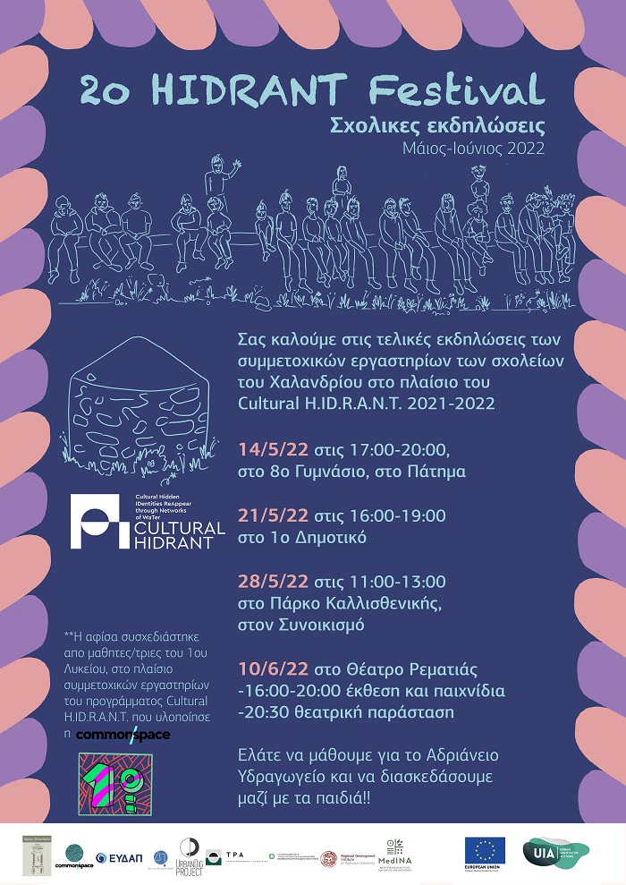 Οι μαθητές/τριες των νηπιαγωγείων, ασχολήθηκαν με αισθητηριακά, βιωματικά παιχνίδια για τα υλικά του Αδριάνειου Υδραγωγείου «στο τότε και στο τώρα». Τα παιδιά του Δημοτικού έφτιαξαν επιτραπέζια παιχνίδια. Γυμνάσια και Λύκεια, ασχολήθηκαν με το επικοινωνιακό υλικό του HIDRANT Festival 2022, δημιουργώντας ένα ραδιοφωνικό σποτ, αφίσα και βίντεο, όλα μέσα από τη διαδικασία του Συμμετοχικού Σχεδιασμού, όπως και «ταξιδιωτικά» ημερολόγια με σκίτσα εμπνευσμένα από τη γειτονιά τους.