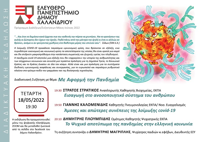 Το Ελεύθερο Πανεπιστήμιο του Δήμου Χαλανδρίου επιστρέφει με την 3η διαδικτυακή συζήτηση, «Με αφορμή την πανδημία», την Τετάρτη 18 Μαΐου 2022 στις 19:30.