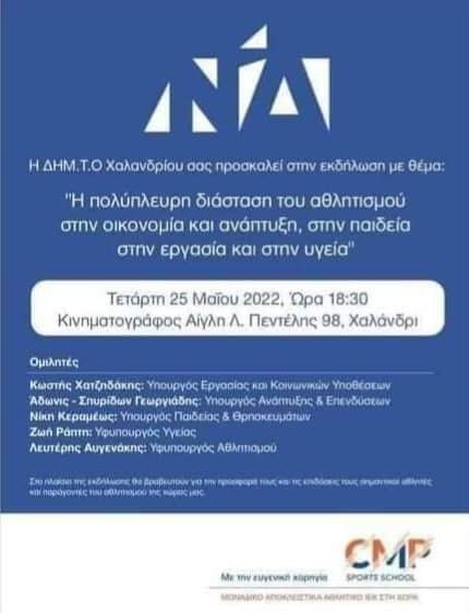 Η ΔΗΜ.Τ.Ο. Νέας Δημοκρατίας Χαλανδρίου προσκαλεί την Τετάρτη 25 Μαΐου 2022 και ώρα 18:30, στον κινηματογράφο Αίγλη (Λεωφ. Πεντέλης 98, Χαλάνδρι), σε εκδήλωση με θέμα: