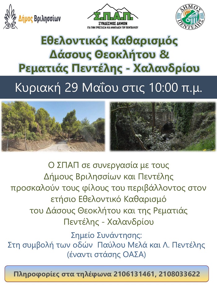 Ο Σύνδεσμος Δήμων για την Προστασία και Ανάπλαση του Πεντελικού (ΣΠΑΠ) σε συνεργασία με τους Δήμους Βριλησσίων και Πεντέλης, στο πλαίσιο της 8ης Γιορτής Περιβάλλοντος του Δήμου Βριλησσίων, την Κυριακή 29 Μαΐου 2022 θα πραγματοποιήσουν Εθελοντικό Καθαρισμό του Δάσους Θεοκλήτου και της Ρεματιάς Πεντέλης - Χαλανδρίου. Η δράση έχει στόχο τη διατήρηση και την ανάδειξη του εξαιρετικού φυσικού τοπίου του Πεντελικού.