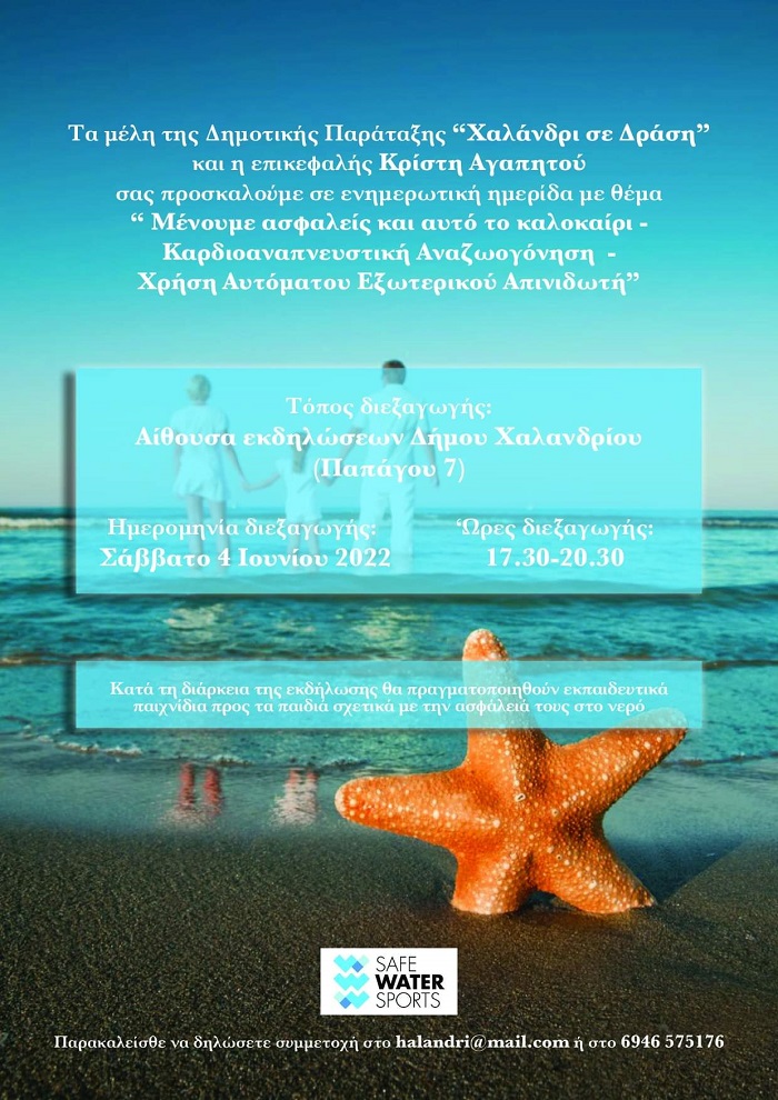 Τα μέλη της Δημοτικής Παράταξης “Χαλάνδρι σε Δράση” και η επικεφαλής Κρίστη Αγαπητού προσκαλούν σε ενημερωτική ημερίδα με θέμα «Μένουμε ασφαλείς και αυτό το καλοκαίρι - Καρδιοαναπνευστική Αναζωογόνηση - Χρήση Αυτόματου Εξωτερικού Απινιδωτή», το Σάββατο 4 Ιουνίου 2022 (ώρες 17:30-20:30) στην αίθουσα εκδηλώσεων του Δήμου Χαλανδρίου (Παπάγου 7).