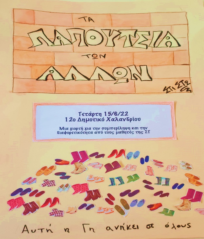 Την Τετάρτη 15 Ιουνίου 2022 και ώρα 19:30, στον προαύλιο χώρο του σχολείου τους, οι μαθητές θα παρουσιάσουν μια μουσικοκινητική παράσταση βασισμένη στο βιβλίο της Άλκηστης Χαλικιά «Τα παπούτσια των άλλων».