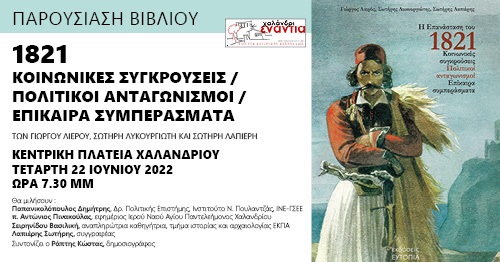 Αυτά και άλλα πολλά θα συζητήσουμε στην Πλατεία Χαλανδρίου την Τετάρτη 22 Ιουνίου στις 19:30, στην εκδήλωση/βιβλιοπαρουσίαση που διοργανώνει η Πρωτοβουλία Πολιτών «Χαλάνδρι Ενάντια», με αφορμή την έκδοση του βιβλίου «Επανάσταση του 1821: Κοινωνικές Συγκρούσεις, Πολιτικοί Ανταγωνισμοί, Επίκαιρα Συμπεράσματα» των Γιώργου Λιερού, Σωτήρη Λυκουργιώτη και Σωτήρη Λαπιέρη.