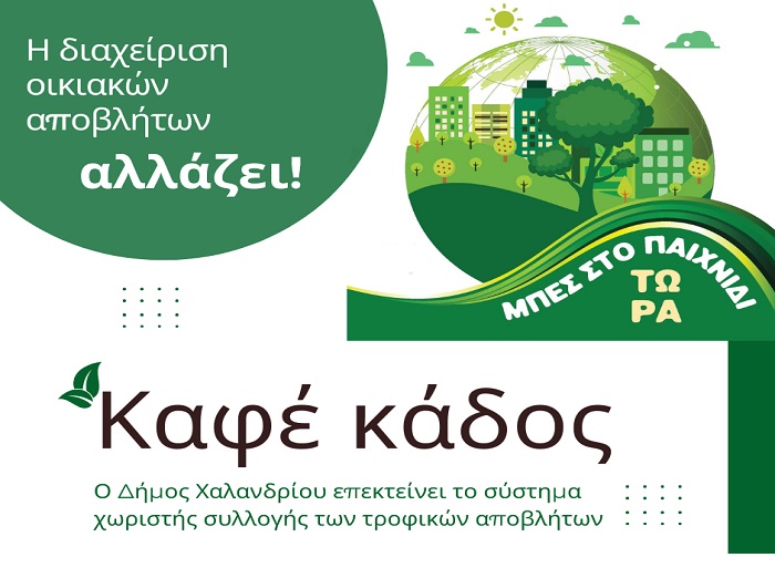 Ο Δήμος Χαλανδρίου επεκτείνει πλέον σε όλη την πόλη το σύστημα χωριστής συλλογής των τροφικών αποβλήτων, τον καφέ κάδο, εκτρέποντας τα τροφικά απόβλητα από την ταφή και δημιουργώντας προϋποθέσεις για την αξιοποίησή τους, με σημαντικά οικονομικά και περιβαλλοντικά οφέλη.