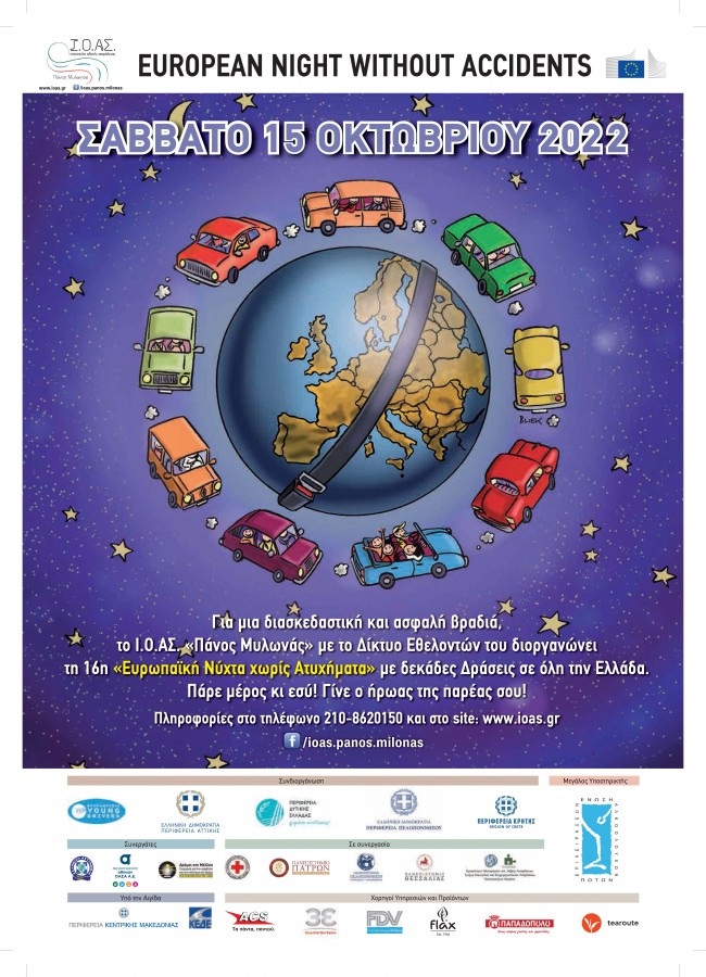 To Ινστιτούτο Οδικής Ασφάλειας (Ι.Ο.ΑΣ.) «Πάνος Μυλωνάς» συνεχίζει δυναμικά τις δράσεις ενεργοποίησης και ευαισθητοποίησης των πολιτών για «έναν κόσμο χωρίς τροχαία δυστυχήματα». Έτσι, το Σάββατο 15 Οκτωβρίου 2022, διοργανώνει, όπως κάθε χρόνο, τη 16η «Ευρωπαϊκή Νύχτα χωρίς Ατυχήματα» σε μεγάλες πόλεις στην Ελλάδα.