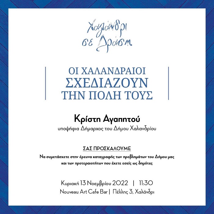 Η Δημοτική Παράταξη «Χαλάνδρι σε Δράση» και η επικεφαλής Υποψήφια Δήμαρχος Χαλανδρίου Κρίστη Αγαπητού έχουμε την ανάγκη να σας ακούσουμε από κοντά και να σας γνωρίσουμε! Δίνουμε μεγάλη βαρύτητα και έμφαση στις ανάγκες σας, στις ανάγκες των δημοτών μας! Μέσα από εσάς θα φτιάξουμε το στρατηγικό μας πλάνο και πρόγραμμα, σχεδιασμένο στις προσδοκίες και προτεραιότητές σας! Σας καλούμε λοιπόν να συμμετέχετε στην έρευνα καταγραφής των προβλημάτων του δήμου μας για να σχεδιάσουμε την επόμενη μέρα για εσάς μαζί με εσάς! Θα περάσουμε από κάθε γειτονιά του Χαλανδρίου να σας γνωρίσουμε και να σας ακούσουμε από κοντά! Κάθε Κυριακή του Νοεμβρίου θα είμαστε σε ένα καινούριο μέρος, θα συναντιόμαστε να συζητάμε τους προβληματισμούς σας και να οργανώσουμε μαζί το πρόγραμμα του συνδυασμού μας!