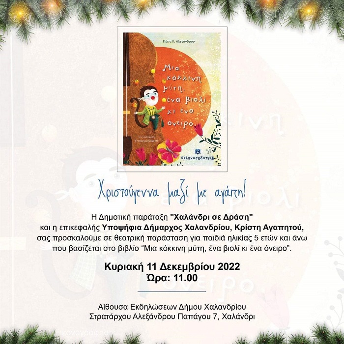 Η δημοτική παράταξη «Χαλάνδρι σε Δράση» και η επικεφαλής της και υποψήφια Δήμαρχος Χαλανδρίου Κρίστη Αγαπητού σας προσκαλούν στη θεατρική παράσταση για παιδιά «Μια κόκκινη μύτη, ένα βιολί κι ένα όνειρο».