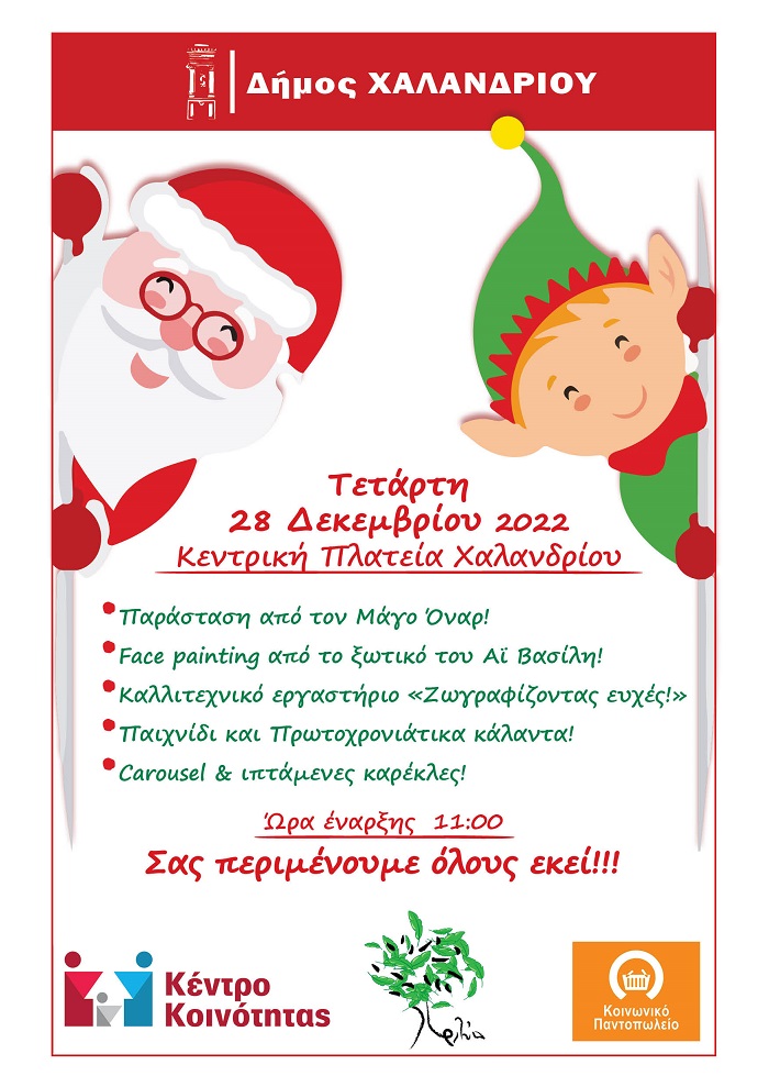 Ένα διήμερο ενημέρωσης και δράσεων διοργανώνει η Κοινωνική Υπηρεσία του Δήμου Χαλανδρίου, στις 27 & 28 Δεκεμβρίου, στην Κεντρική Πλατεία της πόλης.