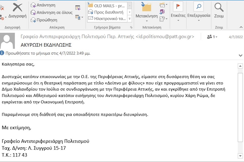 Στη νέα του ανακοίνωση διατείνεται ότι δήθεν την «μπλόκαρε» ο ίδιος, επειδή ήταν μάλλον «υπερκοστολογημένη». Στο email όμως που έχει αποστείλει στο Δήμο (5.7.22) μας ενημερώνει ότι «δυστυχώς» η παράσταση «αν και εγκρίθηκε από την Επιτροπή Πολιτισμού και Αθλητισμού κατόπιν εισήγησης του αντιπεριφερειάρχη Πολιτισμού, κ. Χάρη Ρώμα, δεν εγκρίνεται από την Οικονομική Επιτροπή».