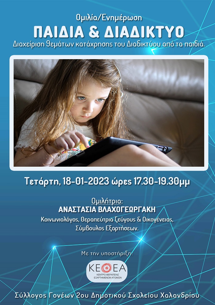 Ο Σύλλογος Γονέων του "Λιτσείου" 2ου Δημοτικού Σχολείου Χαλανδρίου προσκαλεί την Τετάρτη 18 Ιανουαρίου 2023, ώρες 17:30-19:30, σε ομιλία/ενημέρωση με θέμα «Παιδιά & Διαδίκτυο - Διαχείριση θεμάτων κατάχρησης του διαδικτύου από τα παιδιά», που θα πραγματοποιηθεί στην αίθουσα εκδηλώσεων του σχολείου (Φιλ. Λίτσα & Σεβ. Καλλισπέρη).