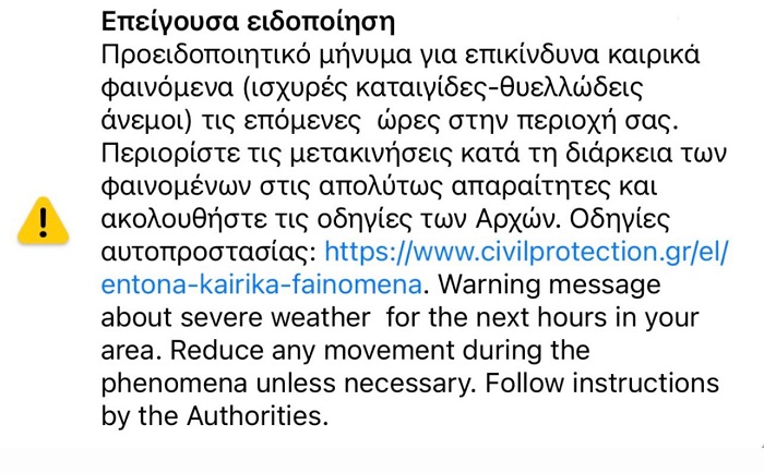 Νωρίτερα σήμερα, στάλθηκε μήνυμα μέσω του 112 στους κατοίκους της Αττικής, προειδοποιώντας τους για επικίνδυνα καιρικά φαινόμενα (ισχυρές καταιγίδες - θυελλώδεις άνεμοι) τις επόμενες ώρες.