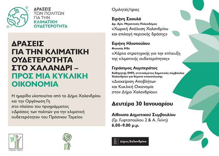 Ο Δήμος Χαλανδρίου και η Οργάνωση Γη οργανώνουν την ημερίδα «Δράσεις για την κλιματική ουδετερότητα στο Χαλάνδρι – Προς μια κυκλική οικονομία», που θα πραγματοποιηθεί τη Δευτέρα 30 Ιανουαρίου 2023, στην αίθουσα του Δημοτικού Συμβουλίου (Γρ. Γυφτοπούλου 2 & Γκίνη), ώρες 6:00-9:00 μ.μ.