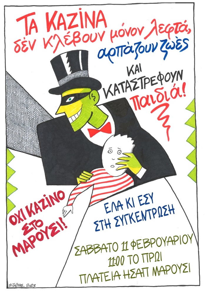 Όλοι και όλες στη Συγκέντρωση Διαμαρτυρίας κατά της μετεγκατάστασης του καζίνο Πάρνηθας στο Μαρούσι, το Σάββατο 11 Φεβρουαρίου 2023 και ώρα 11:00 π.μ. στην πλατεία Ευτέρπης στο σταθμό Αμαρουσίου του ηλεκτρικού.