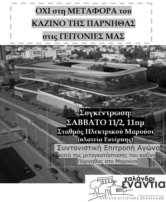 Στηρίζουμε το κάλεσμα της Συντονιστικής Επιτροπής Αγώνα κατά της μετεγκατάστασης του καζίνο Πάρνηθας (με συμμετοχή φορέων και συλλόγων από Μαρούσι, Χαλάνδρι, Φιλοθέη)