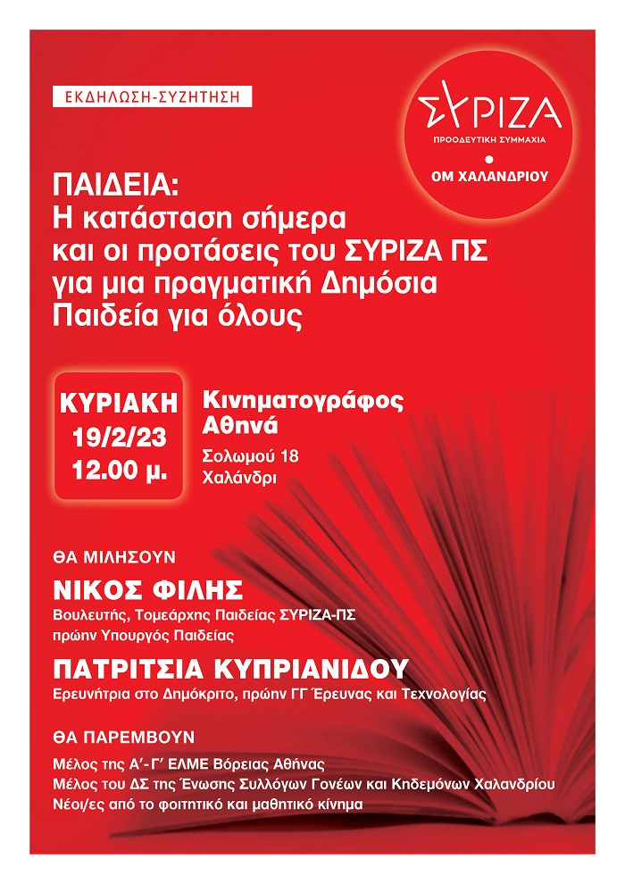 Η ΟΜ ΣΥΡΙΖΑ-ΠΣ Χαλανδρίου πραγματοποιεί εκδήλωση για θέματα Παιδείας, την Κυριακή 19 Φεβρουαρίου 2023 και ώρα 12:00, στον κινηματογράφο "Αθηνά" (Σολωμού 18, Χαλάνδρι).