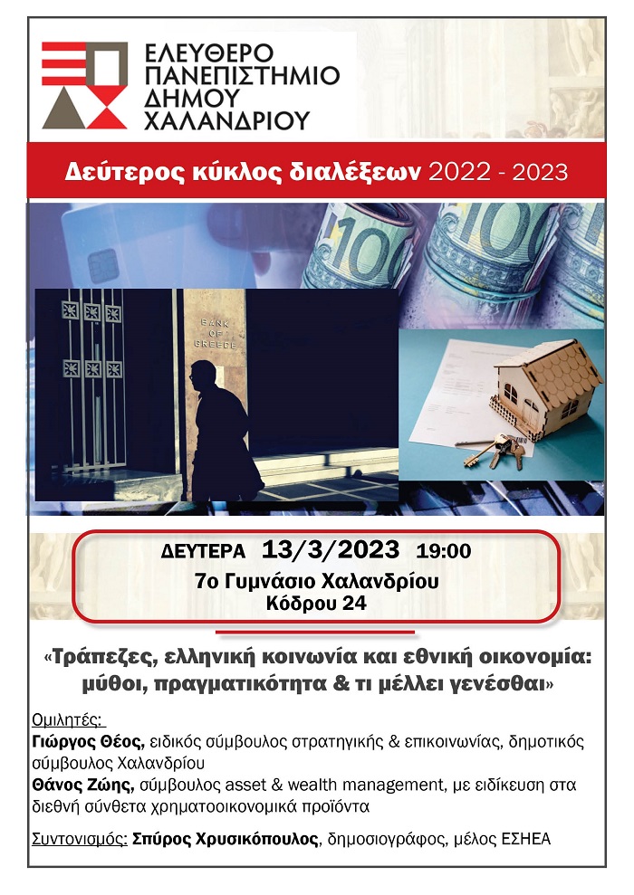 Στο πλαίσιο του νέου κύκλου διαλέξεων του Ελεύθερου Πανεπιστημίου Χαλανδρίου για το Β’ τρίμηνο, τη Δευτέρα 13 Μαρτίου 2023 και ώρα 19:00, στο 7ο Γυμνάσιο Χαλανδρίου (Κόδρου 24), πραγματοποιείται η διάλεξη: «Τράπεζες, ελληνική κοινωνία και εθνική οικονομία: μύθοι, πραγματικότητα και τι μέλλει γενέσθαι».