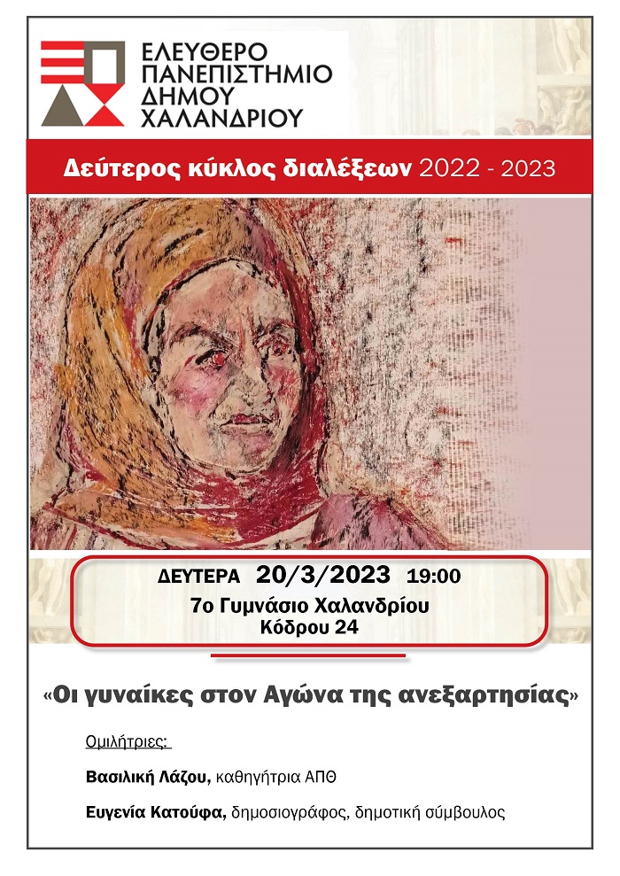 Στο πλαίσιο του νέου κύκλου διαλέξεων του Ελεύθερου Πανεπιστημίου Χαλανδρίου για το β’ τρίμηνο ’22-’23, πραγματοποιείται τη Δευτέρα 20 Μαρτίου 2023 και ώρα 19:00 στο 7ο Γυμνάσιο Χαλανδρίου (Κόδρου 24) η διάλεξη: «Οι γυναίκες στον Αγώνα της ανεξαρτησίας».