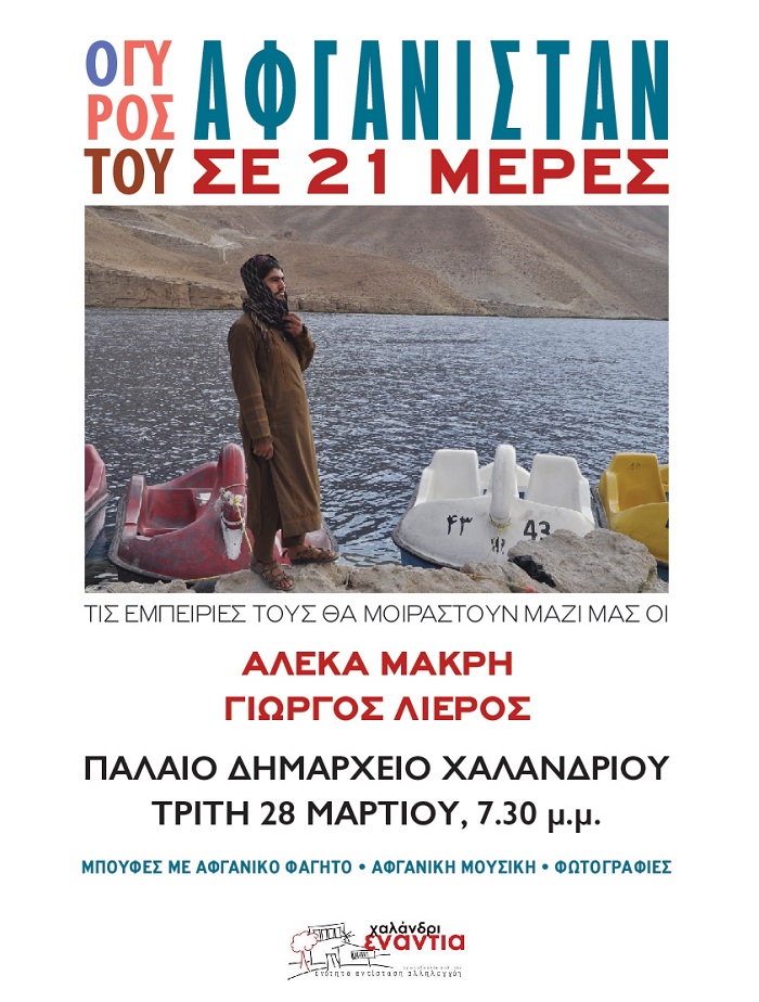 Εκδήλωση με θέμα «Ο γύρος του Αφγανιστάν σε 21 μέρες» διοργανώνει η Πρωτοβουλία Πολιτών “Χαλάνδρι Ενάντια”.