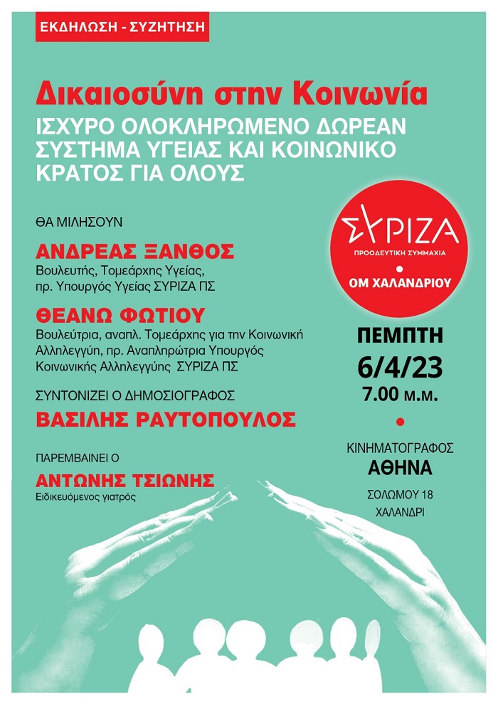 Η ΟΜ Χαλανδρίου ΣΥΡΙΖΑ-ΠΣ διοργανώνει την Πέμπτη 6 Απριλίου 2023 και ώρα 19:00 στον κινηματογράφο "ΑΘΗΝΑ" (Σολωμού 18, Χαλάνδρι) την τελευταία θεματική εκδήλωση ενημέρωσης/συζήτησης με τα μέλη και τους φίλους του κόμματος με θέμα: «Δικαιοσύνη στην Κοινωνία. Ισχυρό ολοκληρωμένο Δωρεάν Σύστημα Υγείας και Κοινωνικό Κράτος για όλους», με εισηγητές τον Ανδρέα Ξανθό, τομεάρχη και πρώην υπουργό Υγείας και τη Θεανώ Φωτίου, αναπληρώτρια τομεάρχη και πρώην αναπληρώτρια υπουργό Κοινωνικής Αλληλεγγύης.