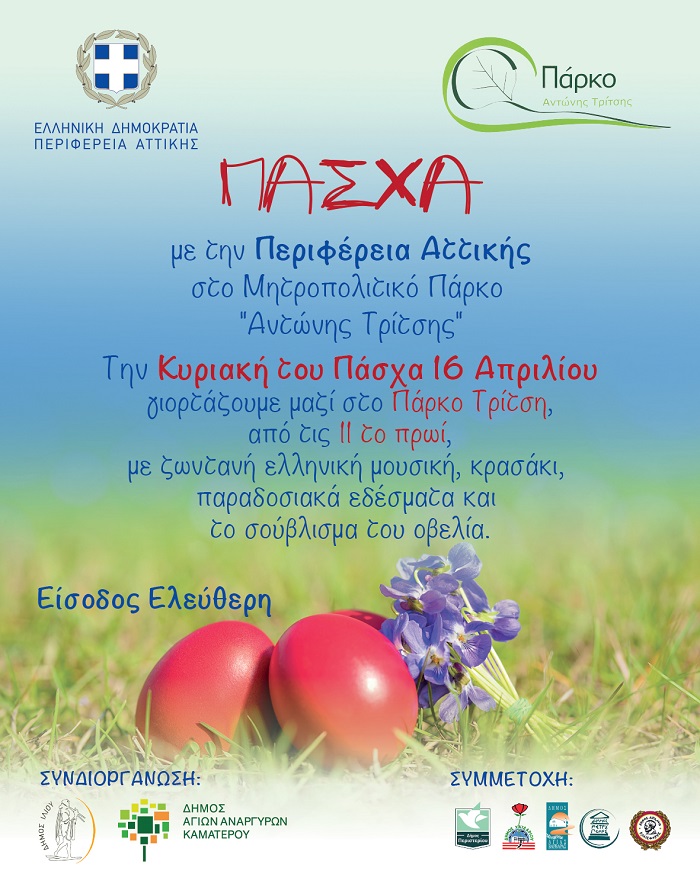 Η Περιφέρεια Αττικής θα τιμήσει την ημέρα του Πάσχα στις 16 Απριλίου με μια μεγάλη γιορτή, ανοικτή σε όλους τους πολίτες, στο Μητροπολιτικό Πάρκο «Αντώνης Τρίτσης».