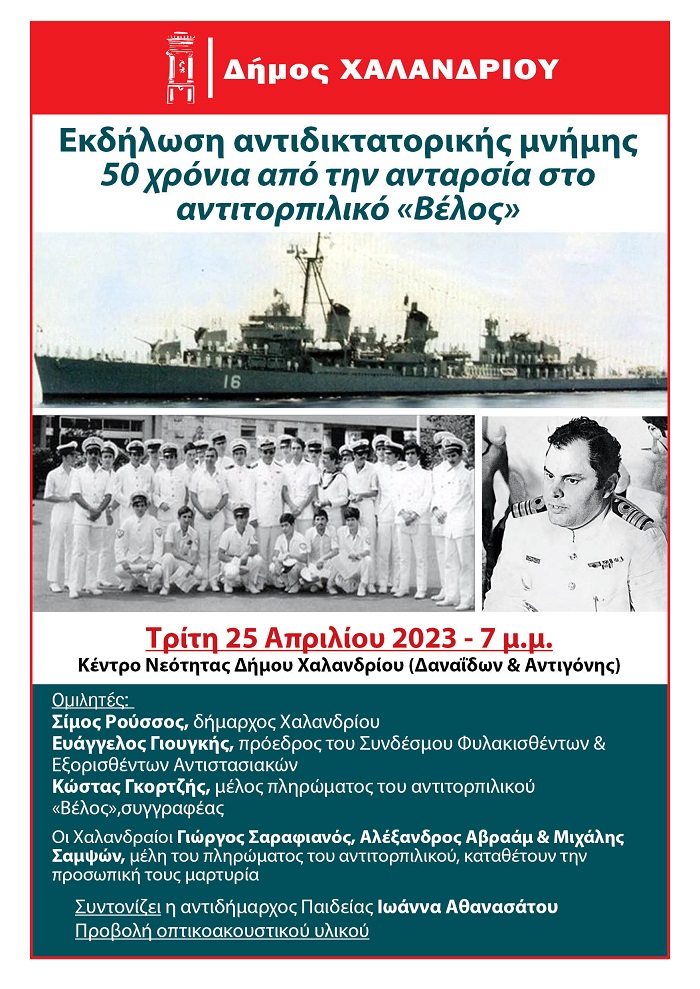 Ο Δήμος Χαλανδρίου διοργανώνει εκδήλωση αντιδικτατορικής μνήμης και τιμής για τα 50 χρόνια από την ανταρσία στο αντιτορπιλικό «Βέλος», στις 25 Μαΐου 1973, γεγονός το οποίο κατάφερε ισχυρό πλήγμα στη χούντα των συνταγματαρχών και κατέδειξε διεθνώς ότι το καθεστώς στερούνταν νομιμοποίησης ακόμα και μέσα στο στράτευμα.