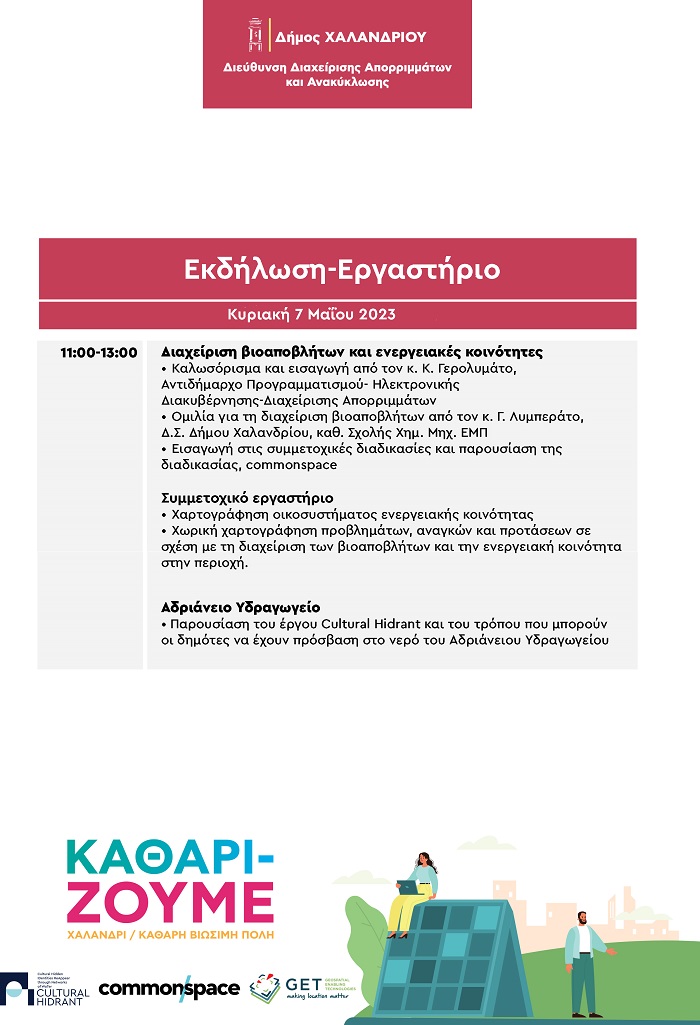 Η εκστρατεία της δ/νσης Διαχείρισης Απορριμμάτων του Δήμου Χαλανδρίου για την ευαισθητοποίηση και κινητοποίηση των πολιτών συνεχίζεται με την πραγματοποίηση νέας ενημερωτικής εκδήλωσης και συμμετοχικού εργαστηρίου για τους κατοίκους της περιοχής του Συνοικισμού. Η εκδήλωση θα πραγματοποιηθεί την Κυριακή 7 Μαΐου 2023, στις 11:00, στην αίθουσα εκδηλώσεων του 3ου Δημοτικού Σχολείου (Μαραθώνος & Μ. Ασίας, Χαλάνδρι).