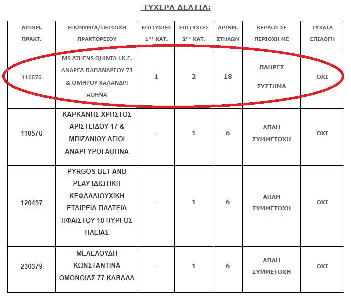 Το υπερτυχερό δελτίο κατατέθηκε στο πρακτορείο ΟΠΑΠ MS ATHENS QUINTA Ι.Κ.Ε. (Ανδρέα Παπανδρέου 73 & Ομήρου, στο Χαλάνδρι), με πλήρες σύστημα 18 στηλών, αξίας 9,00 €.