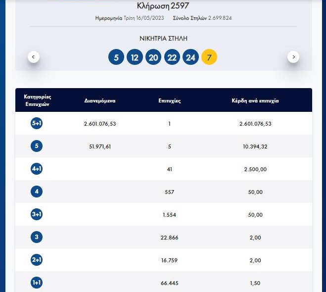 Ένα τυχερό δελτίο βρέθηκε στην 1η κατηγορία (5+1) κατά τη διαλογή της 16/5/2023 της 2597ης κλήρωσης του ΤΖΟΚΕΡ που κερδίζει το ποσό των 2.601.076,53 € και το οποίο φέρει και δύο επιτυχίες στη 2η κατηγορία (5) όπου η κάθε επιτυχία κερδίζει από 10.394,32 €.