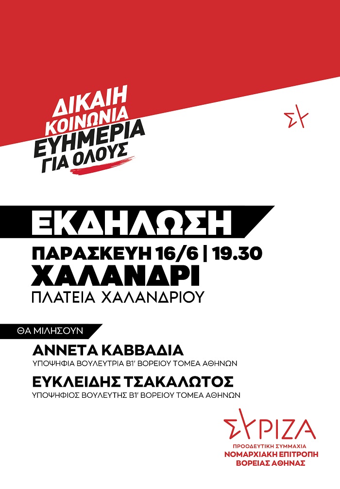 Η Νομαρχιακή Επιτροπή Βόρειας Αθήνας ΣΥΡΙΖΑ - Π.Σ. προσκαλεί σε ανοιχτή πολιτική εκδήλωση την Παρασκευή 16 Ιουνίου 2023 και ώρα 19:30 στην πλατεία Χαλανδρίου.