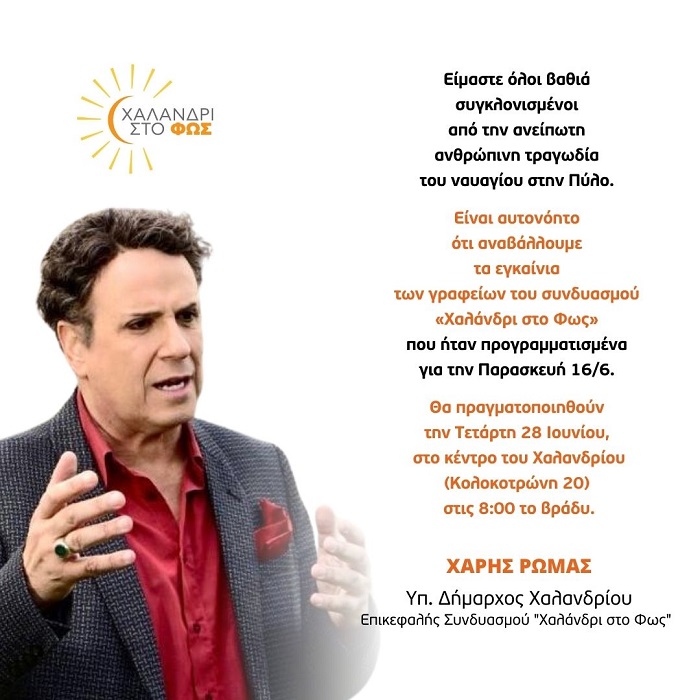 «Είμαστε όλοι βαθιά συγκλονισμένοι από την ανείπωτη ανθρώπινη τραγωδία του ναυαγίου στην Πύλο. Είναι αυτονόητο ότι αναβάλλουμε τα εγκαίνια των γραφείων του συνδυασμού “Χαλάνδρι στο Φως” που ήταν προγραμματισμένα για την Παρασκευή 16/6. Θα πραγματοποιηθούν την Τετάρτη 28 Ιουνίου 2023, στο κέντρο του Χαλανδρίου (Κολοκοτρώνη 20), στις 8:00 το βράδυ».