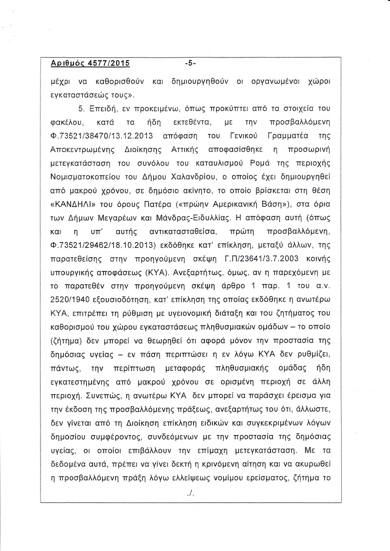 Φυσικά, ...ξέχασε να αναφέρει ότι αυτή η απόφαση για τη μετεγκατάσταση του καταυλισμού (Φ.73521/38470/13.12.2013 της Αποκεντρωμένης Διοίκησης) ΑΚΥΡΩΘΗΚΕ από το ΣτΕ, με την απόφαση 4577/2015, «λόγω ελλείψεως νομίμου ερείσματος», μετά την προσφυγή του Δήμου Μάνδρας – Ειδυλλίας.