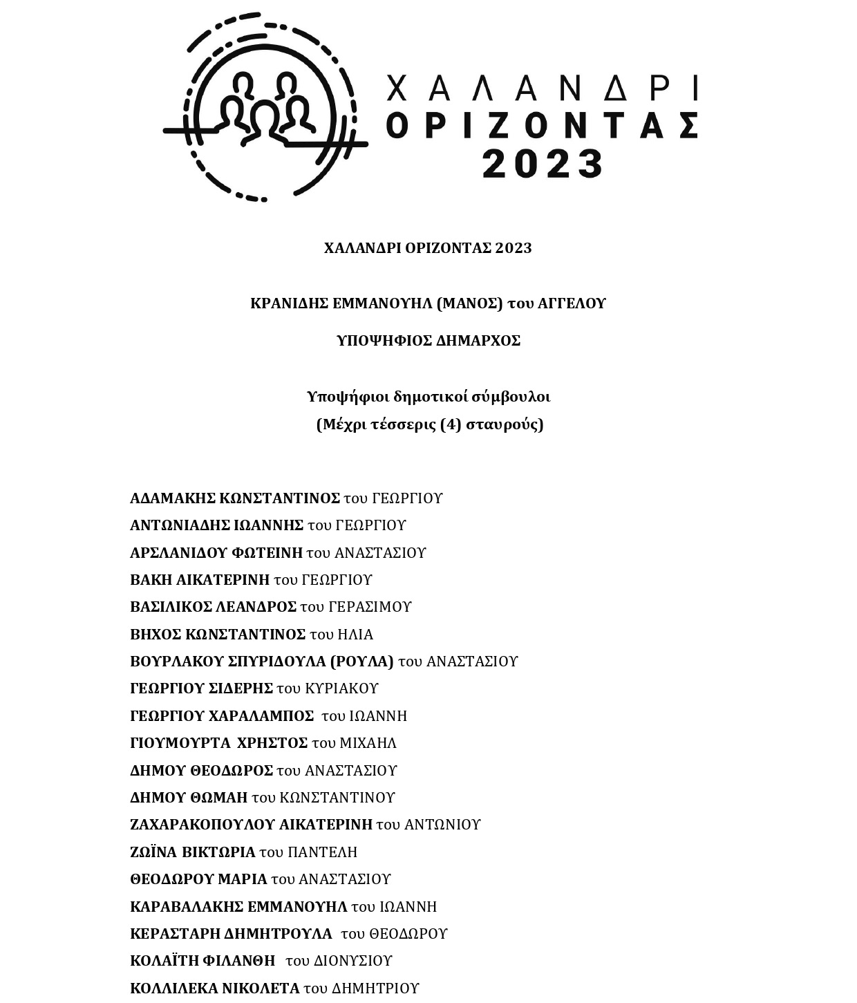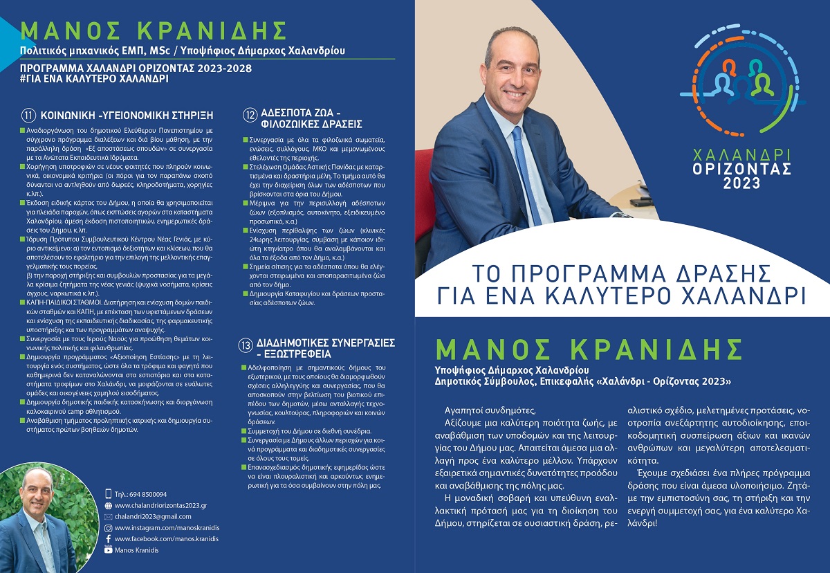 Ζητάμε την εμπιστοσύνη, την στήριξη και την ενεργό συμμετοχή όλων των πολιτών για ένα καλύτερο Χαλάνδρι, με επικεφαλής τον Μάνο Κρανίδη, Χαλανδραίο 3ης γενιάς, μάχιμο πολιτικό μηχανικό με σημαντική προσφορά και δράση στο Δήμο μας.