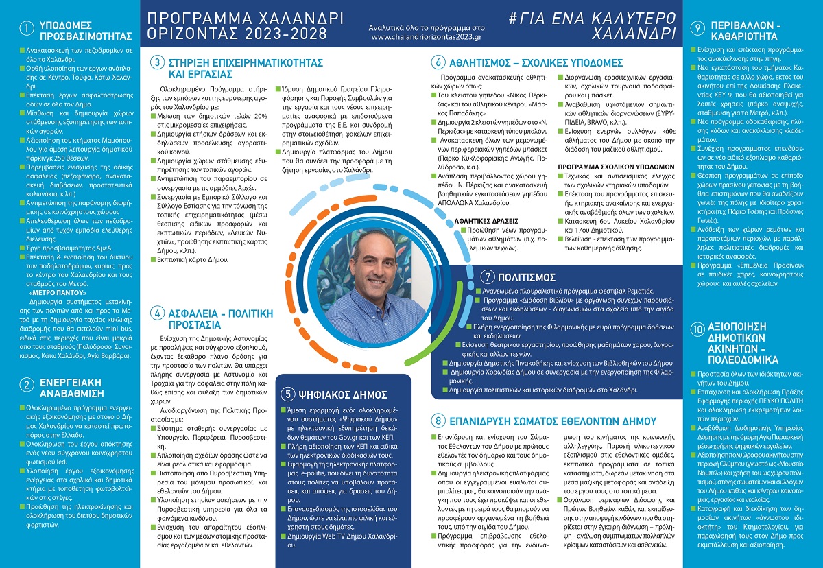 «Πρόκειται για ένα πρόγραμμα που δεν το έχουν φτιάξει διάφοροι «σύμβουλοι» σε κλειστά γραφεία, αλλά είναι το αποτέλεσμα της διαρκούς σύνθεσης και ανταλλαγής γνώσης και προτάσεων της άξιας ομάδας μας με τους συμπολίτες και τους θεσμικούς φορείς της πόλης. Όλοι μας βλέπετε καθημερινά να είμαστε παρόντες, καθ’ όλη την τετραετία, σε όλες τις γειτονιές, στην κοινωνία από όπου πηγάζει η δύναμη του ρεύματος πολιτών Χαλάνδρι Ορίζοντας 2023» κατέληξε στον λόγο του.