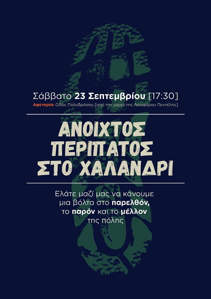 Το 3o HIDRANT festival κλείνει τις φετινές του εκδηλώσεις με έναν ιστορικό περίπατο κατά μήκος του Χαλανδραίικου παρακλαδιού του Αδριάνειου υδραγωγείου. Με αφετηρία τη συμβολή της οδού Πολυδρόσου με τη Ρεματιά, ακολουθούμε τα ίχνη του Αδριάνειου υδραγωγείου εντός της τελευταίας μέχρι τη δεξαμενή του στην οδό Ελ Αλαμέιν. Εκεί, όσοι και όσες το επιθυμούν θα έχουν τη δυνατότητα να επισκεφθούν το εσωτερικό της μόνης δεξαμενής του Αδριάνειου υδραγωγείου που διασώζεται από τα ρωμαϊκά χρόνια.