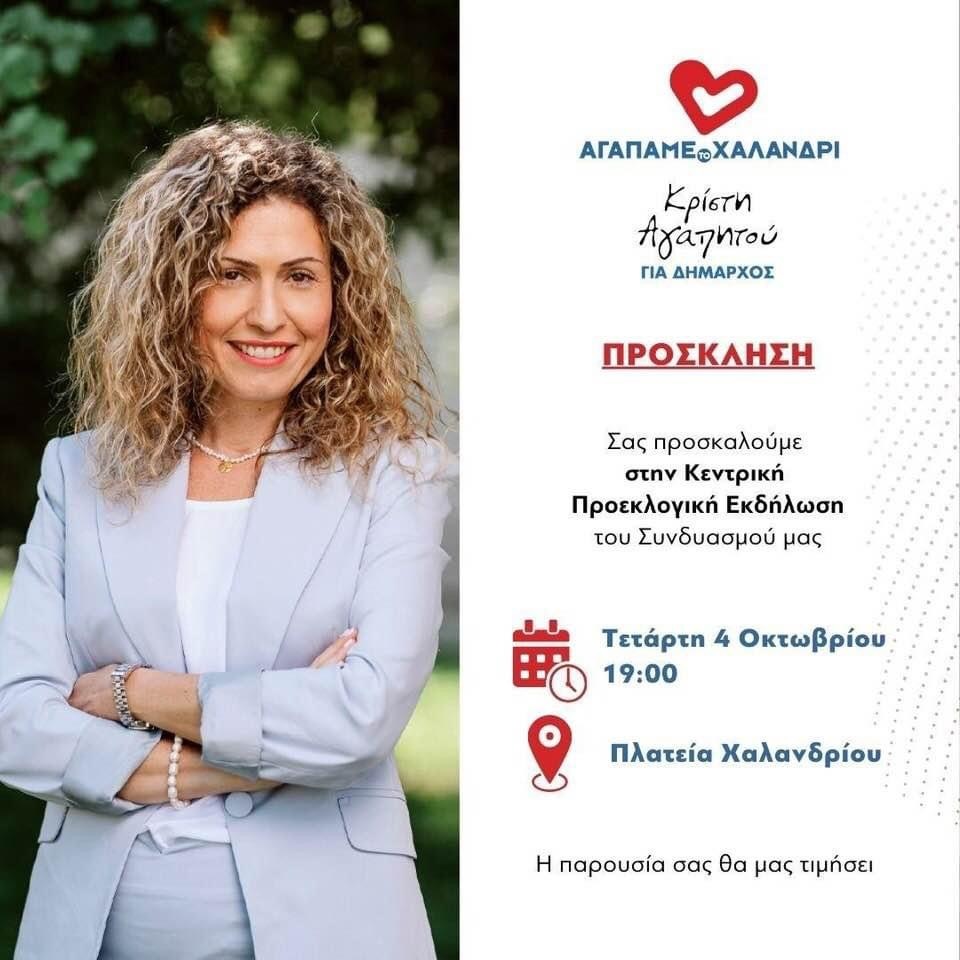 Πρόσκληση στην κεντρική προεκλογική εκδήλωση της υποψήφιας δημάρχου Χαλανδρίου Κρίστης Αγαπητού