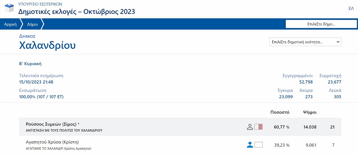 Τα αποτελέσματα του β’ γύρου των Δημοτικών Εκλογών στον Δήμο Χαλανδρίου