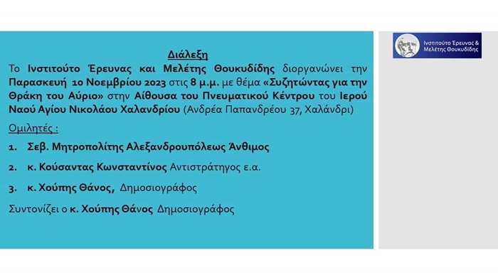 Tο Ινστιτούτο Έρευνας και Μελέτης “Θουκυδίδης” διοργανώνει διάλεξη - συζήτηση με θέμα «Συζητώντας για την Θράκη του Αύριο», την Παρασκευή 10 Νοεμβρίου 2023 στις 8:00 μ.μ., στην αίθουσα του Πνευματικού Κέντρου του Ιερού Ναού Αγίου Νικολάου Χαλανδρίου (Ανδρέα Παπανδρέου 37, Χαλάνδρι).