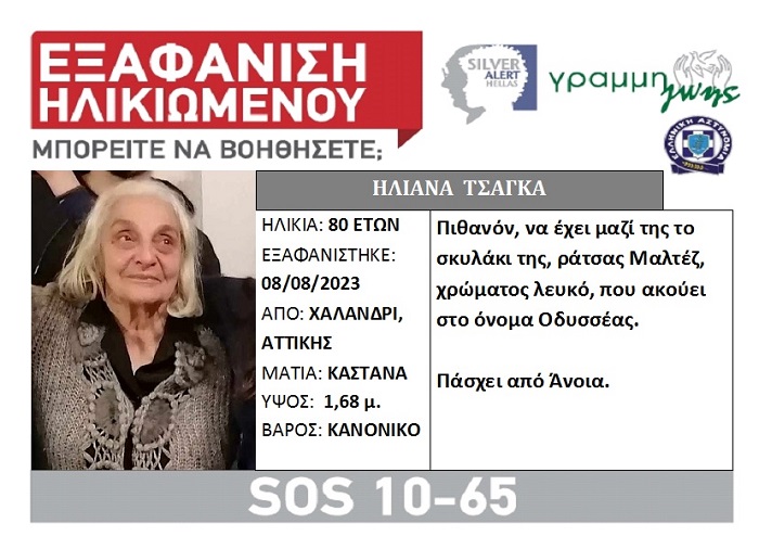 Μυστήριο παραμένει η εξαφάνιση της Ηλιάνας Τσάγκα 80 χρόνων, που χάθηκε στο Χαλάνδρι με το σκυλάκι της, στην καθιερωμένη πρωινή της βόλτα.
