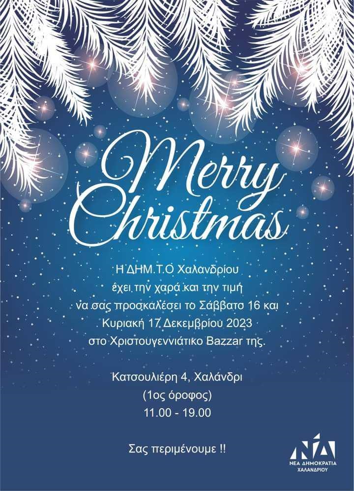 Η ΔΗΜ.Τ.Ο. Νέας Δημοκρατίας Χαλανδρίου έχει την χαρά και την τιμή να σας προσκαλέσει το Σάββατο 16 και την Κυριακή 17 Δεκεμβρίου 2023 στο Χριστουγεννιάτικο Bazaar της.