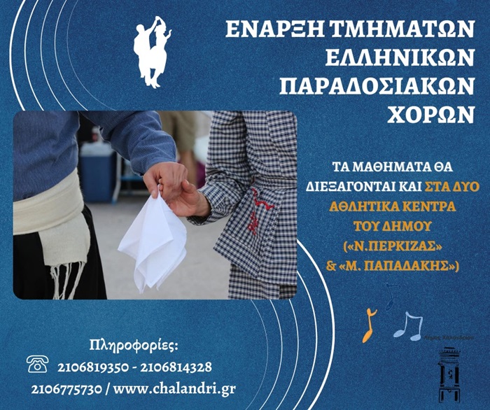 Η Διεύθυνση Παιδείας, Αθλητισμού & Νέας Γενιάς του Δήμου Χαλανδρίου ανακοίνωσε την επανέναρξη των τμημάτων ελληνικών παραδοσιακών χορών, τα οποία θα πραγματοποιούνται στα αθλητικά κέντρα «Νίκος Πέρκιζας» & «Μάρκος Παπαδάκης».