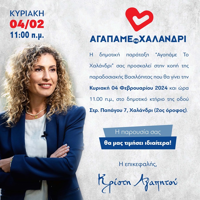 Η δημοτική παράταξη “Αγαπάμε το Χαλάνδρι” σας προσκαλεί στην κοπή της παραδοσιακής Βασιλόπιτας που θα γίνει την Κυριακή 4 Φεβρουαρίου 2024 και ώρα 11:00 π.μ., στο δημοτικό κτήριο της οδού Στρ. Παπάγου 7, Χαλάνδρι (2ος όροφος).