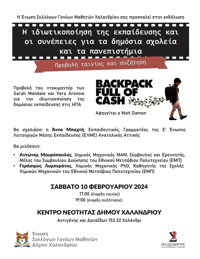 Ένωση Γονέων Χαλανδρίου: Εκδήλωση για την ιδιωτικοποίηση της εκπαίδευσης